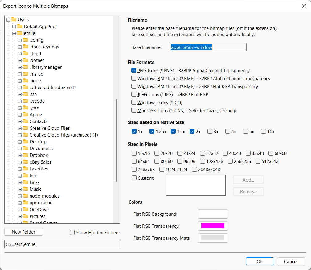 Need multiple versions of the same icon in different sizes or formats? Use this command to export a batch of icons with custom scale settings: