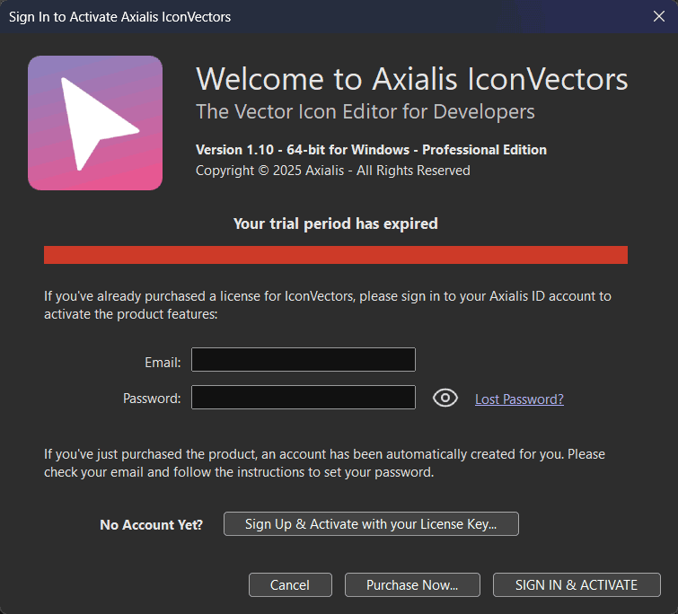 When you purchase the product online, a license key is associated with your Axialis ID account. This account is created during your first purchase (or linked to your existing one). To activate the application: