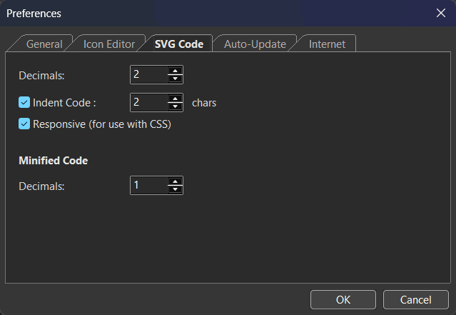SVG Code — Formatting options for exported SVG code (precision, indentation, responsive output, minification).