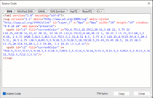 Tabbed formats: - SVG (editable) - Minified SVG - SVG Symbol - XAML (Microsoft format) - VueTS - ReactTS - C++