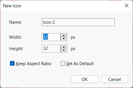 In this dialog, you can define the icon’s width and height in pixels. Enable Keep Aspect Ratio to maintain proportions. You can also choose to set this size as the default for new documents.