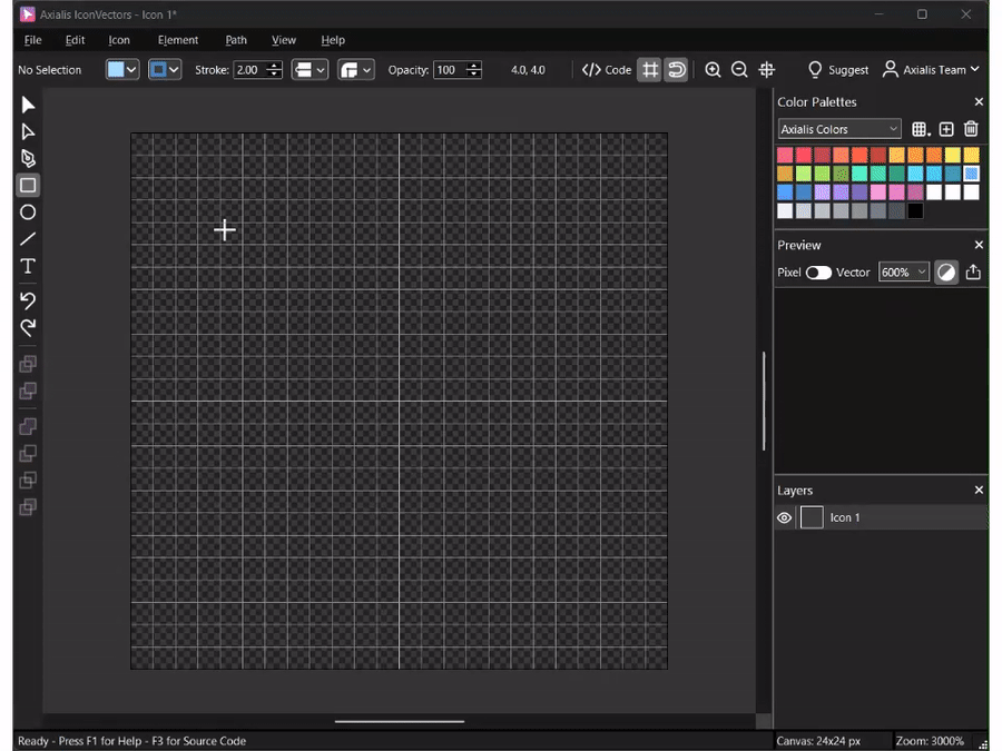 Pixel / Vector toggle button - Pixel: Renders the icon as a bitmap using the native resolution. When zoomed, the preview remains pixelated. - Vector: Displays the icon with smooth vector rendering.